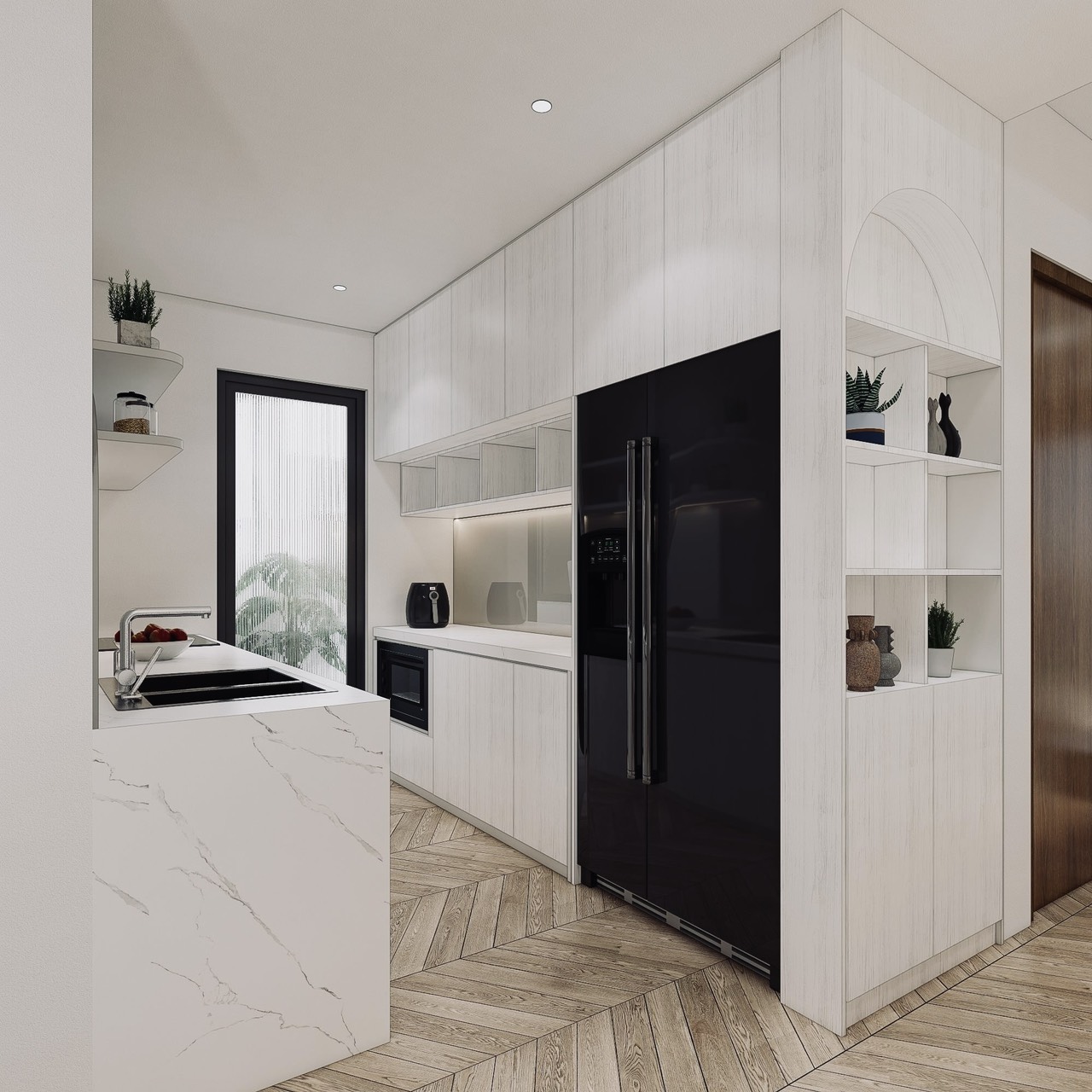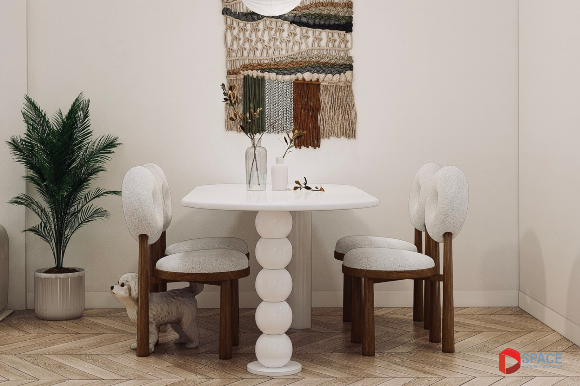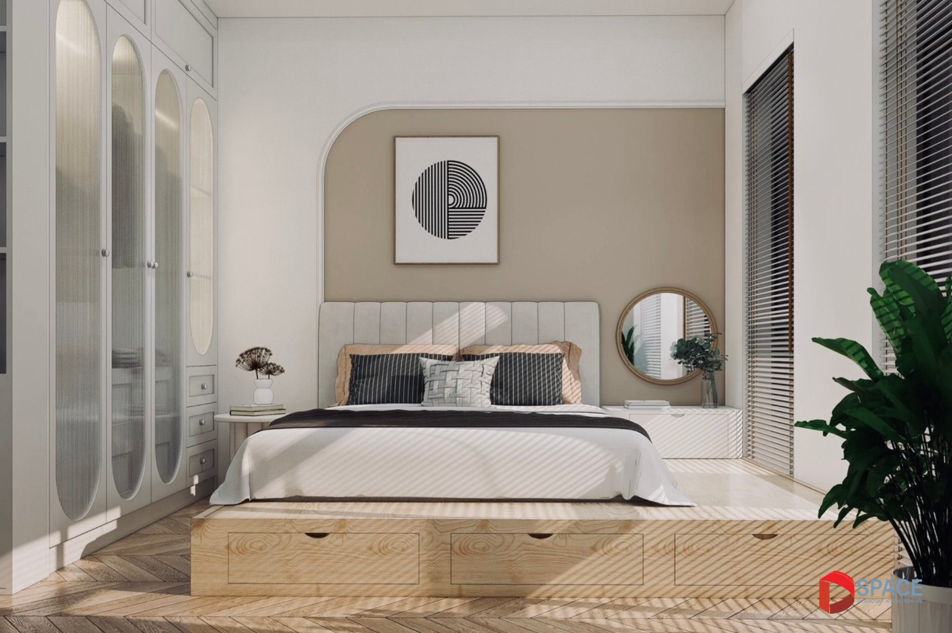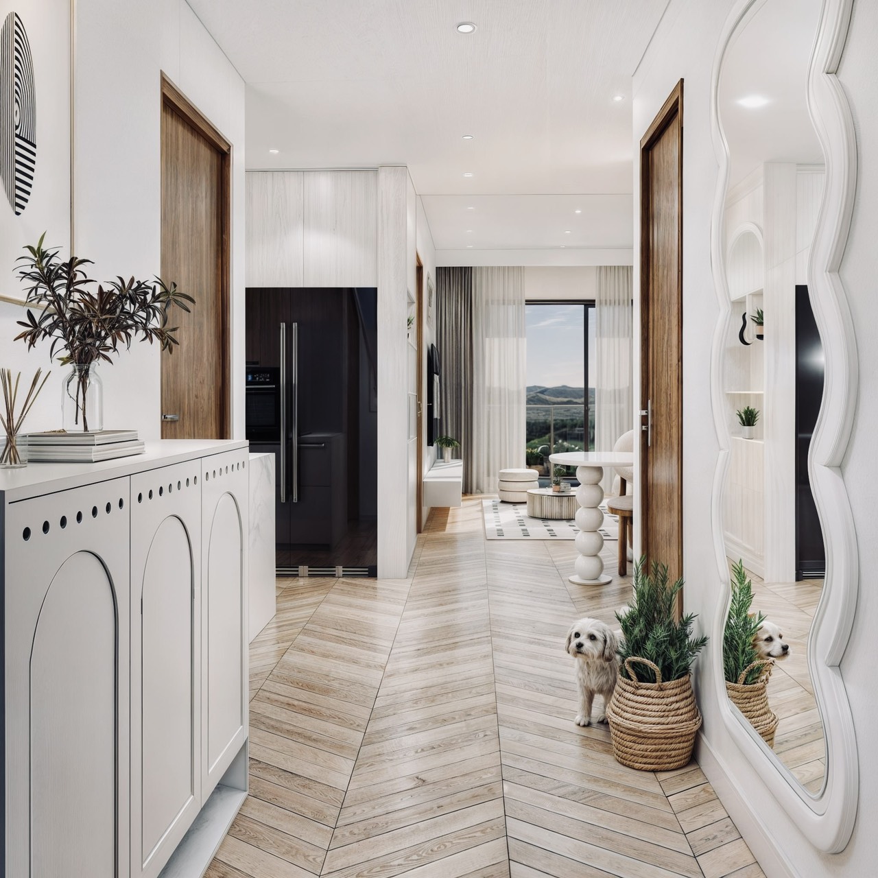 Thiết kế tổng thể căn hộ theo phong cách hiện đại, đề cao sự tối giản, tinh tế trong từng đường nét và chi tiết. Gam màu chủ đạo trắng kem, kết hợp hài hòa với điểm nhấn màu nâu và đen, tạo nên sự sang trọng, đẳng cấp cho không gian sống. Đồng thời, màu sắc này cũng tạo cảm giác nhẹ nhàng, thư giãn, phù hợp với nhịp sống hiện đại. Các đường cong mềm mại được sử dụng tinh tế để trang trí tường, tạo điểm nhấn cho căn hộ và góp phần mang lại cảm giác nhẹ nhàng, thư giãn.