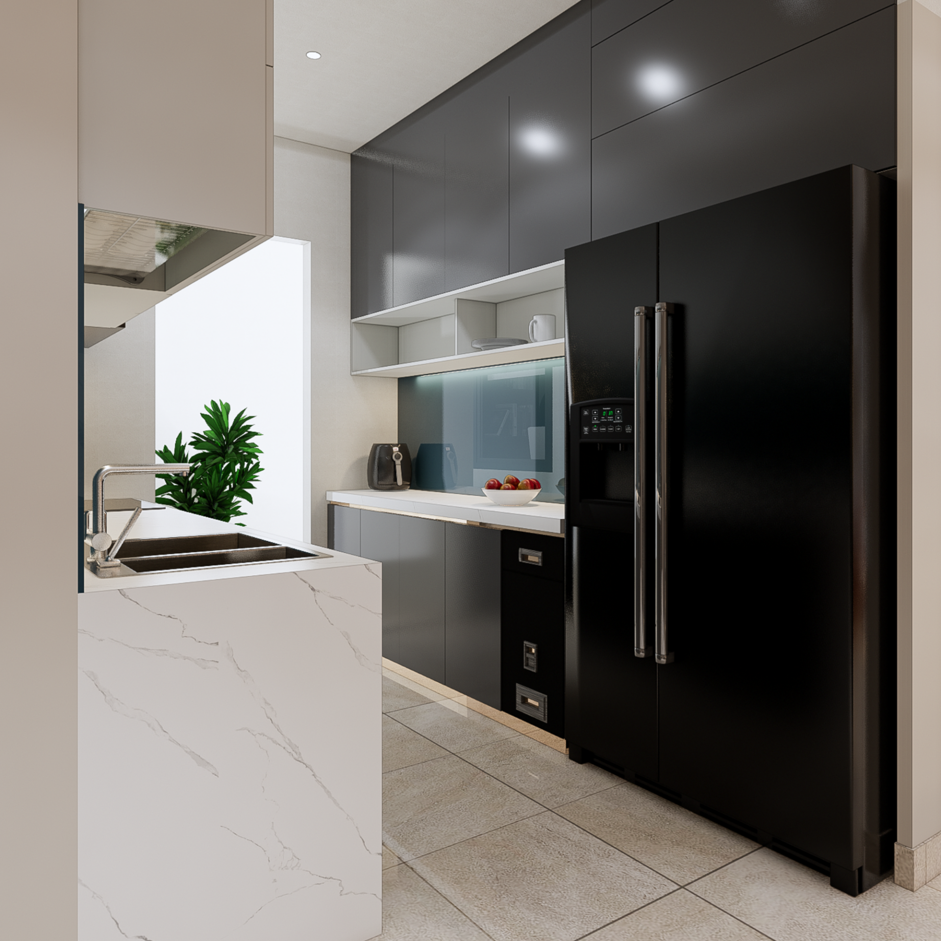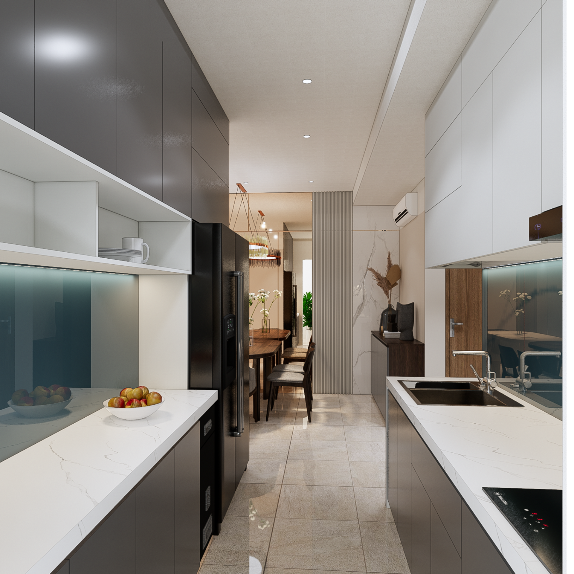 Kế tiếp là khu vực bếp ăn, không gian này nổi bật với hai tông màu trắng đen đối lập, rất hiện đại và sang trọng. Tại đây, các kiến trúc sư đã khéo léo phân chia để giúp không gian bếp đảm bảo được cảm giác sáng, thoáng và sạch sẽ.