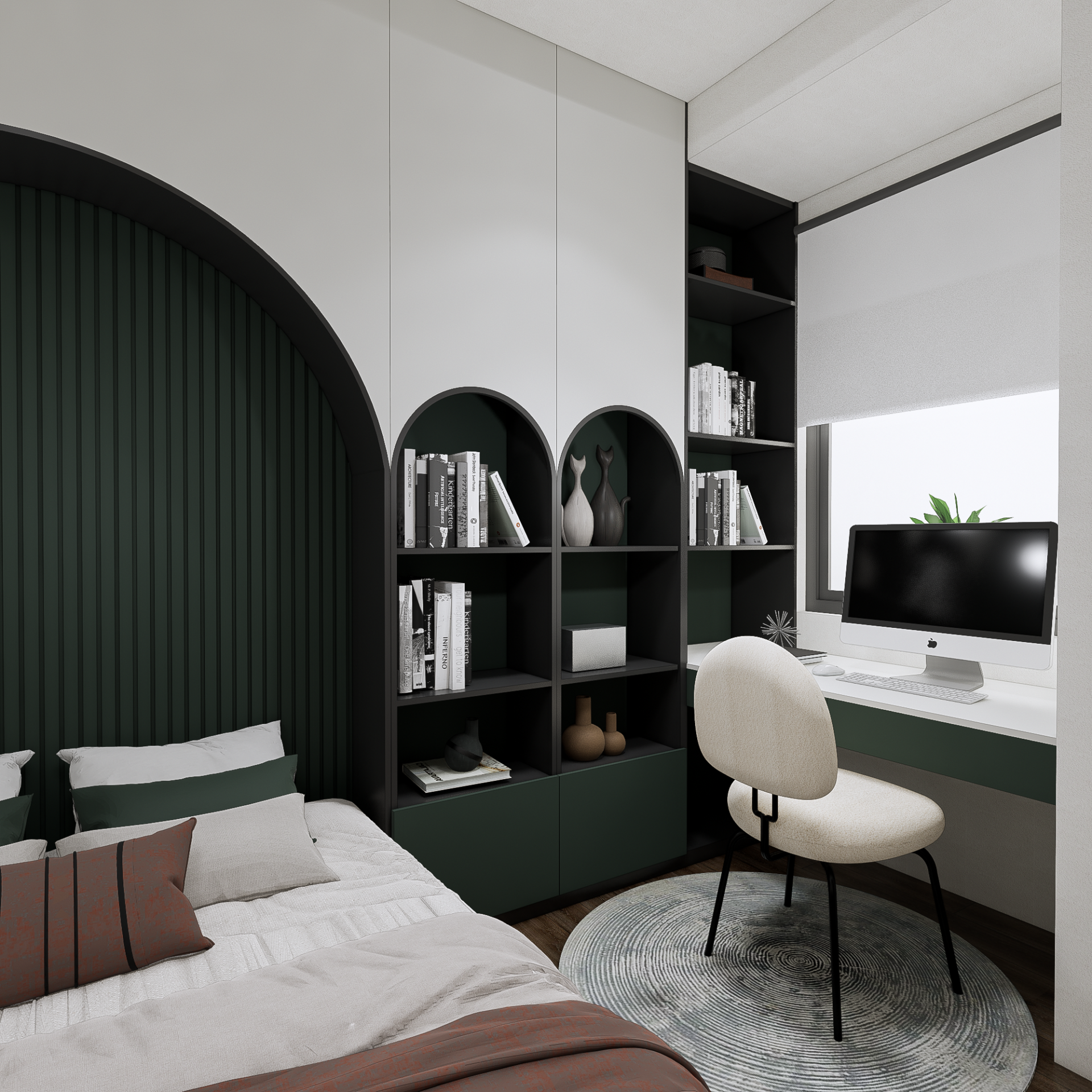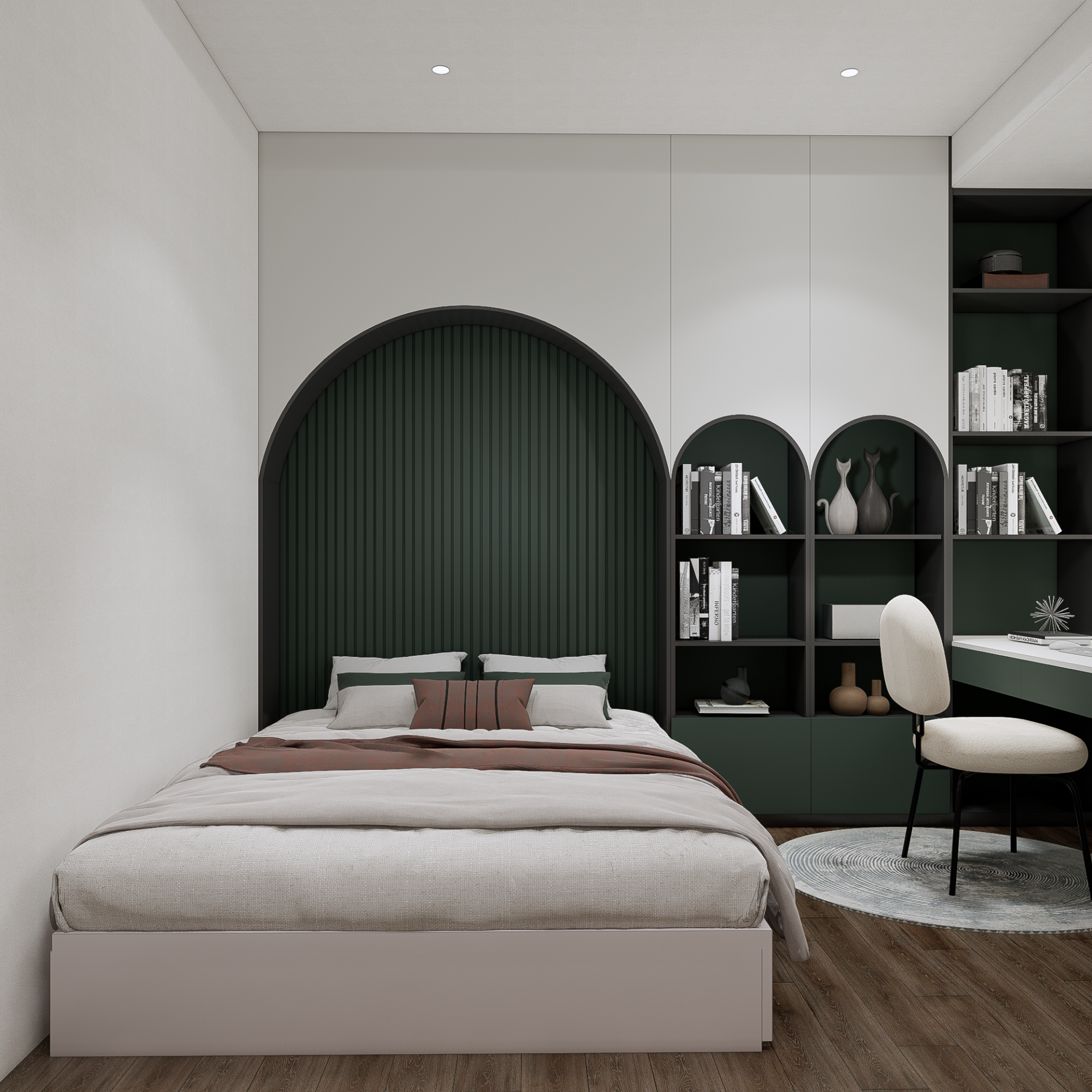 Phòng ngủ thứ hai mang đến một cái nhìn hoàn toàn khác, vẫn giữ nền trắng nhưng gam màu rêu đậm được phối chiếm gần 50% không gian nên cả gian phòng toát lên sự cá tính, độc đáo vô cùng.