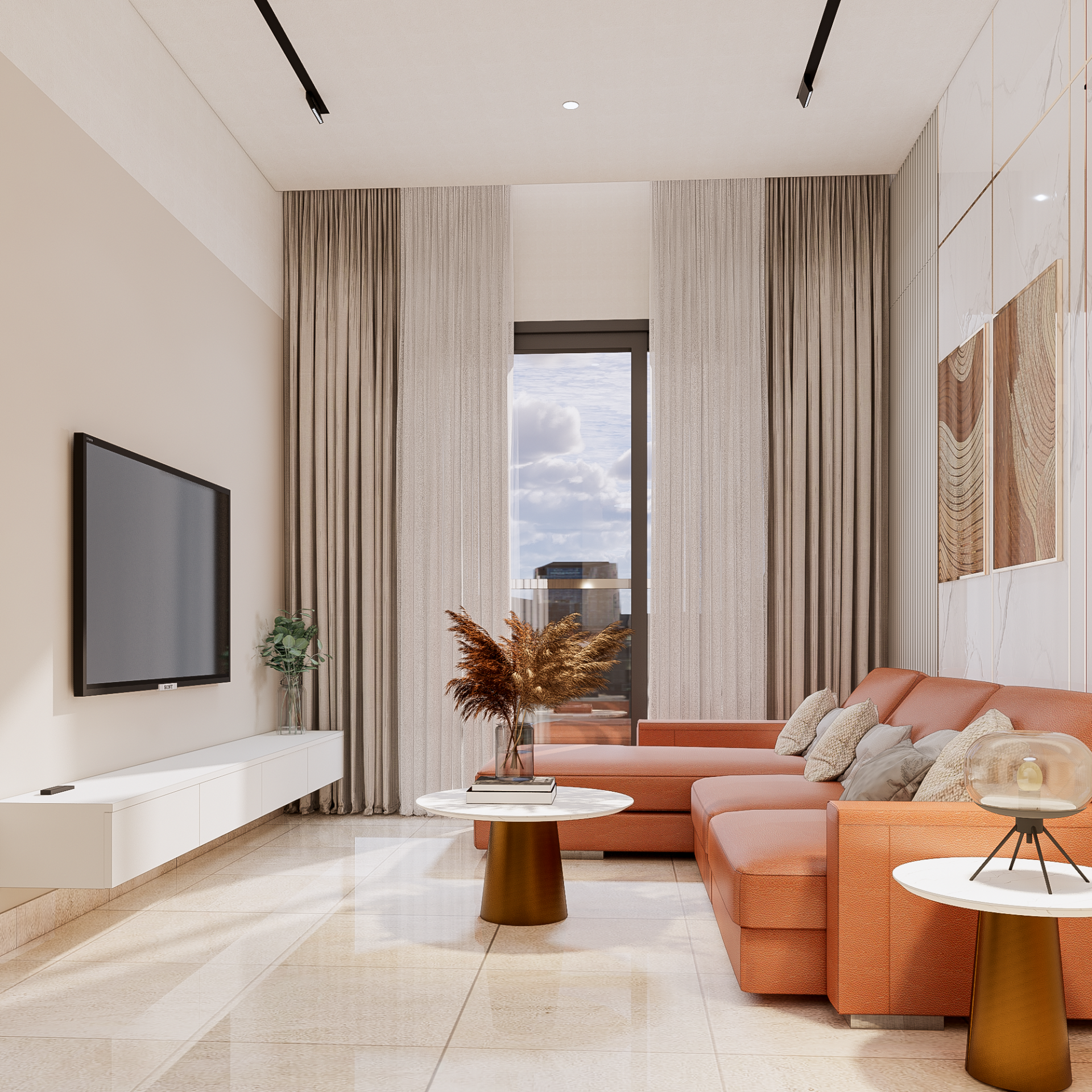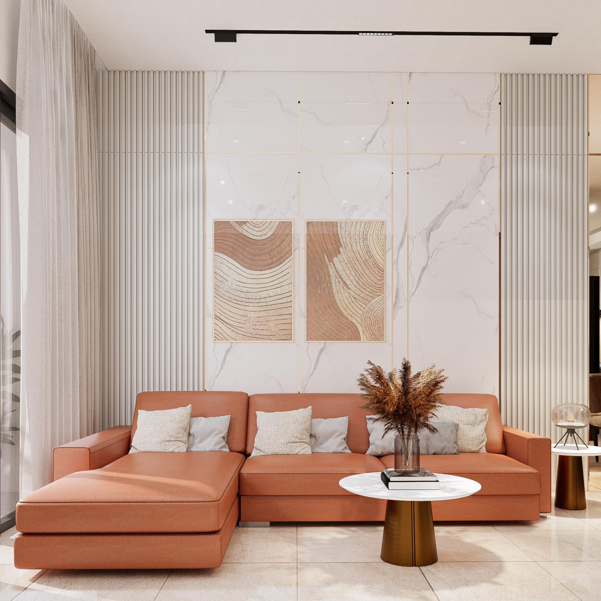 Bước vào căn hộ, điểm thu hút đầu tiên chính là phòng khách, tại đây gia chủ cần một không gian tươi mới, hiện đại. Với điểm nhấn là bộ sofa da màu cam giúp cả căn phòng màu trắng kem nổi bật hơn, tươi trẻ và hiện đại hơn. Tinh tế kết hợp thêm các phụ kiện như bàn sofa, rèm, tranh treo tường…đảm bảo sự hài hòa trong màu sắc.