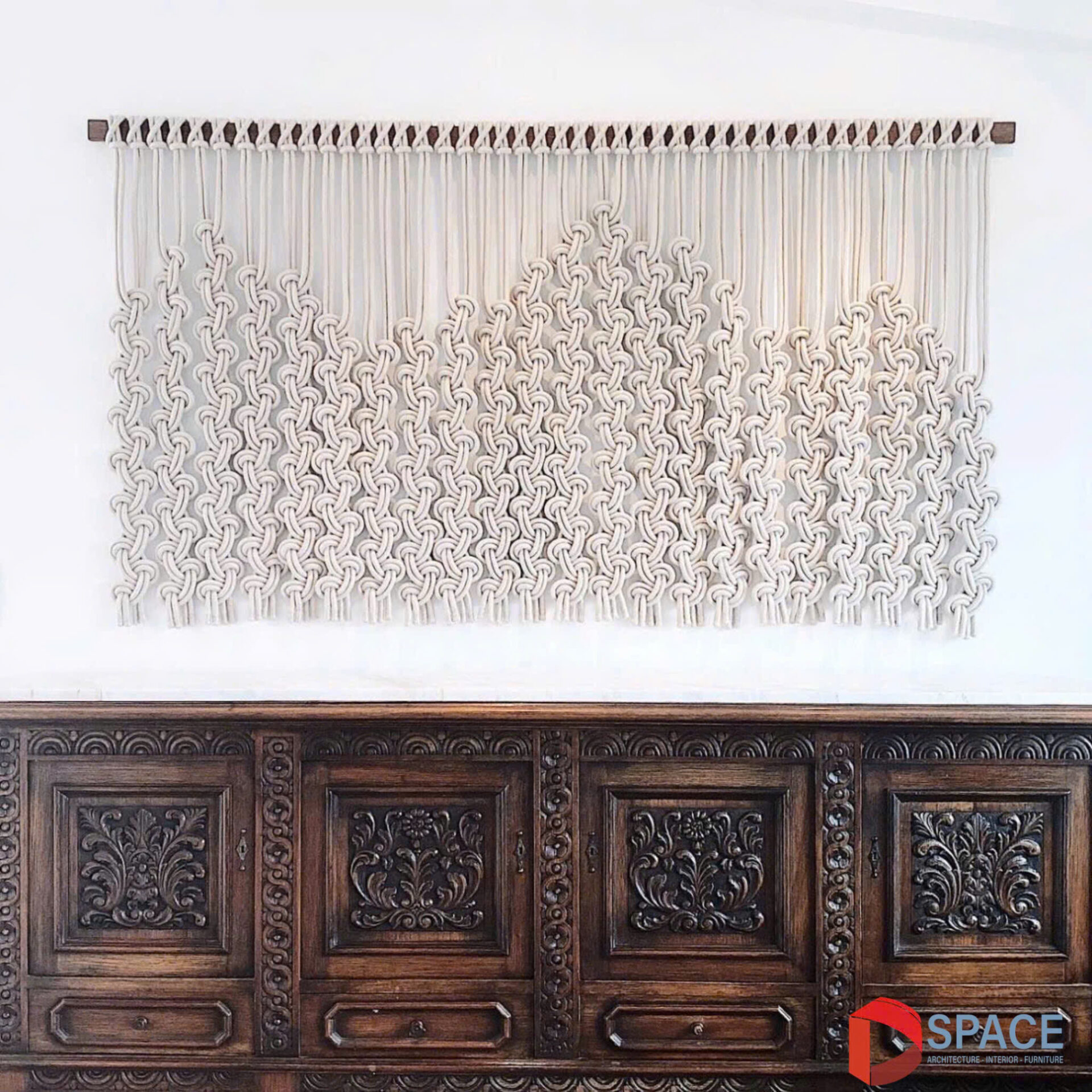 Ấn tượng đầu tiên là sự mềm mại và uyển chuyển của những sợi dây thừng được thắt nút một cách có chủ ý. Các nút thắt tạo thành những hoa văn, họa tiết vừa đơn giản nhưng lại vô cùng tinh tế và thu hút. Màu sắc tự nhiên của dây thừng, thường là các gam màu trung tính như be, trắng kem hay nâu nhạt, mang đến cảm giác thư thái, dễ chịu và hài hòa cho không gian.