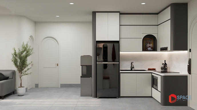 – Lựa chọn vật liệu bền đẹp, dễ lau chùi Nên cân nhắc các loại vật liệu có bề mặt trơn nhẵn, dễ lau chùi vệ sinh. Cùng với đó là khả năng cách nhiệt, chống thấm tốt.- Màu sắc trong thiết kế nhà bếp Cùng với xu hướng thiết kế nội thất phòng bếp theo phong cách hiện đại, tối giản, nội thất bếp tông màu trung tính, nhã nhặn như trắng, be, đen hay màu gỗ cũng được đặc biệt ưa chuộng. Những màu sắc này mang tới cảm giác dễ chịu cho thị giác, giúp diện mạo căn bếp thêm thanh lịch.
